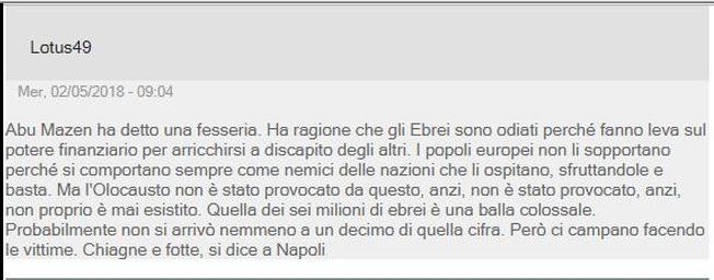 « gli Ebrei sono odiati perché fanno leva sul potere finanziario per arricchirsi a discapito degli altri. I popoli europei non li sopportano perché si comportano sempre come nemici delle nazioni che li ospitano, sfruttandole e basta. Ma l’Olocausto non è stato provocato da questo, anzi, non è stato provocato, anzi, non proprio è mai esistito. Quella dei sei milioni di ebrei è una balla colossale. Probabilmente non si arrivò nemmeno a un decimo di quella cifra. Però ci campano facendo le vittime. Chiagne e fotte, si dice a Napoli».