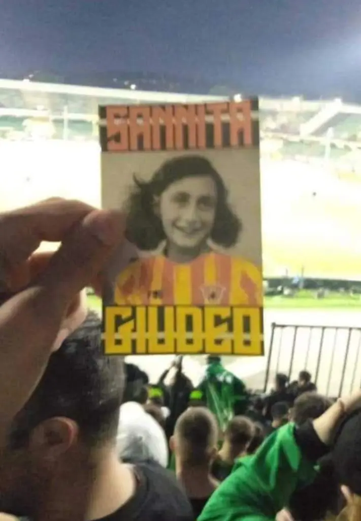 Si tratterà senz’altro di un’iniziativa di un numero ridotto di sconsiderati, non condivisa dalla stragrande maggioranza della tifoseria biancoverde, ma il gesto resta e la vergogna pure per aver utilizzato il sorriso della ragazzina deportata e uccisa dai nazisti come veicolo di insulti, nella convinzione evidentemente che dire ‘sannita giudeo’ possa essere realmente un’offesa. Il caso richiama alla mente le immagini diffuse nel corso di un derby capitolino, quando gli ultras della Lazio pensarono bene di realizzare un fotomontaggio con Anna Frank in maglia romanista. Allora le conseguenze furono pesanti, tra Daspo e persone indagate per istigazione all’odio razziale.