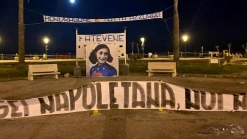 Nei giorni scorsi ha fatto scalpore l’affissione di uno striscione con un’immagine di Anna Frank con la maglia del Napoli e uno striscione con la scritta “Tu sei napoletana, noi no!”. Sul caso era intervenuto il sindaco Francesco Lavanga evidenziando come “La stupenda ed ordinata festa di ieri per la vittoria matematica del campionato di calcio di Serie A da parte del Napoli è stata macchiata da un gesto ignobile da parte di sconsiderati che hanno utilizzato e strumentalizzato il volto di Anna Frank, vittima delle barbarie naziste durante la Seconda guerra mondiale, al fine di deridere, in maniera assurda e spregevole, i tifosi napoletani”.