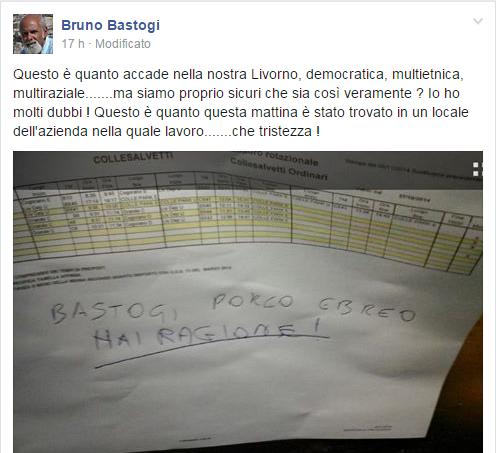 Bruno Bastogi segnala sulla pagina Facebooks del gruppo “Quelli che amano la comunità ebraica di Livorno” che ha trovato un messaggio antisemita in un locale dell’azienda nella quale lavoro. Bastogi ha così commentato su Facebook l’episodio di antisemitismo di cui è stato vittima: “Carissimi colleghi questo è quanto è stato trovato all’interno del locale aziendale della stazione Fs di Livorno, mi è stato inviato da un collega tramite Whatsapp. Non è la prima volta e forse non sarà nemmeno l’ultima che vengo attaccato in questo modo per la mia appartenenza religiosa.”.