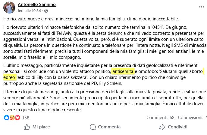 Sannino ha inviato i messaggi anche alla segretaria del PD: “Ho mandato tutto su WhatsApp per correttezza. È stata colpita in maniera brutale, volgare e violenta, con una matrice antisemita e omofoba”.