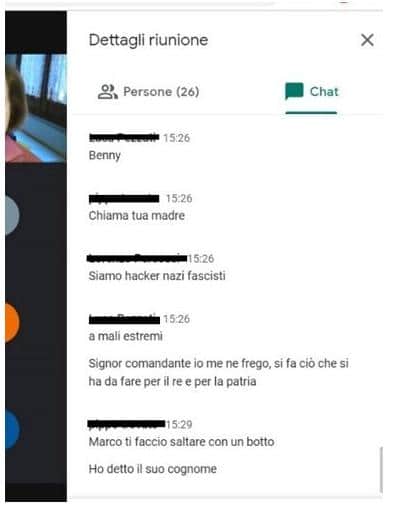 Nei prossimi giorni saranno sentite altre persone: tra queste un altro moderatore dell’iniziativa che si sarebbe dedicato non solo a presentare gli eventi ma anche a cercare “buttare fuori” dalla piattaforma online Meet quei profili che lanciavano insulti e minacce e inviavano video e immagini di stampo nazifascista.“