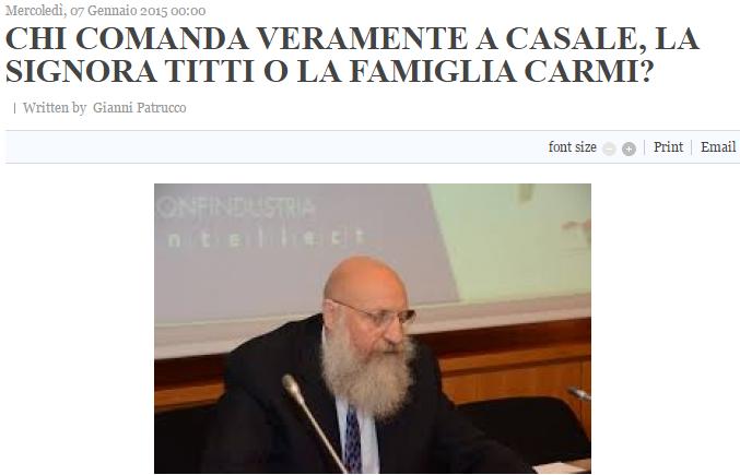 Sul giornale “Alessandria Oggi” è stato pubblicato un articolo “Chi comanda veramente a Casale, la signora Titti o la famiglia Carmi” di Gianni Patrucco dedicato all’amministrazione comunale della città di Casale Monferrato (AL), che attribuisce alla Comunità Ebraica di Casale l’amministrazione “occulta” della politica amministrativa cittadina.