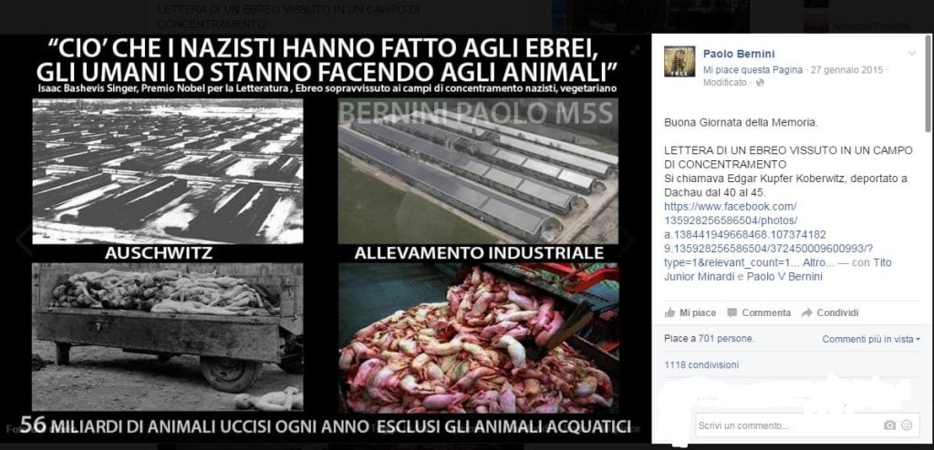 Paolo Bernini, deputato del Movimento5Stelle, in occasione del Giorno della Memoria ha pubblicato sul suo profilo Facebook un post che paragona gli ebrei uccisi nel campo di sterminio di Auschwitz agli animali uccisi negli allevamenti intensivi.