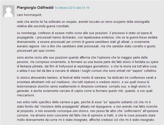“non entro nello specifico delle camere a gas, perché di esse “so” appunto soltanto ciò che mi è stato fornito dal “ministero della propaganda” alleato nel dopoguerra. e non avendo mai fatto ricerche al proposito, e non essendo comunque uno storico, non posso far altro che “uniformarmi” all’opinione comune. ma almeno sono cosciente del fatto che di opinione si tratti, e che le cose possano stare molto diversamente da come mi è stato insegnato, affinché credessi ciò che mi è stato insegnato.”