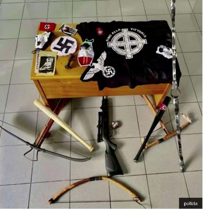 Trovate mazze di ferro, balestre, manifesti inneggianti ad Hitler, ed il collegamento al canale “Sieg Heil”, utilizzato per promuovere contenuti antisemiti, misogini, di matrice neonazista.