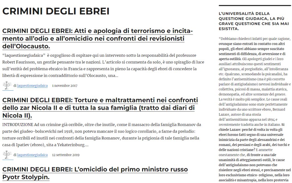 Blog antisemita pubblica lunghi articoli che contengono tutti i più cupi miti dell’antisemitismo. Questo spazio web sembra ispirato alla più aggressiva propaganda nazi-fascista.