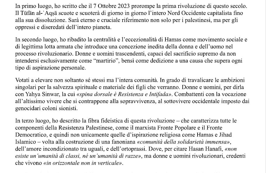 «un insieme sionista, un complesso sionista che comprende gli ambiti dell’istituzionale sinistra liberista e liberale, e della sedicente sinistra anticapitalista di movimento per orientare il dissenso, falsificare la Storia in questa nazione, ridotta a un nido di blatte»