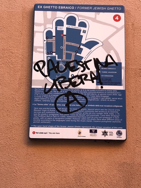 Stampa 26 Novembre 2023 Bologna, targa vandalizzata Luogo: Bologna Fonte: CE Una targa che racconta la storia del Ghetto ebraico è stata vandalizzata con la scritta “Palestina libera”.