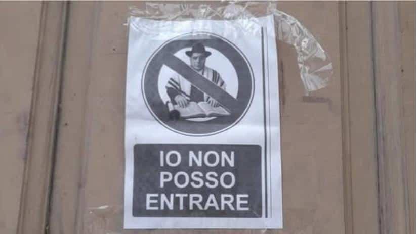 Sulla porta del municipio di Brandizzo (TO) nella notte di Capodanno ignoti affiggono un volantino antisemita dove è raffigurato un uomo ebreo mentre legge la Torah, inserito in un cerchio rosso barrato con la scritta «Io non posso entrare».