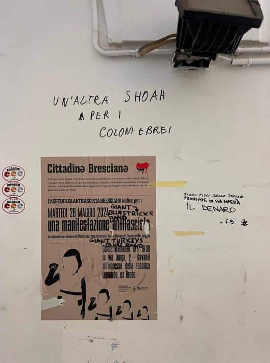 Stampa 10 Febbraio 2025 Brescia, scritta antisemita Luogo: Brescia Fonte: Segnalazione CE «Un’altra Shoah per i coloni ebrei» Brescia, in Corso Goffredo Mameli, 23, sulla parte interna di un pilastro, è comparsa la seguente scritta: «Un’altra Shoah per i coloni ebrei».