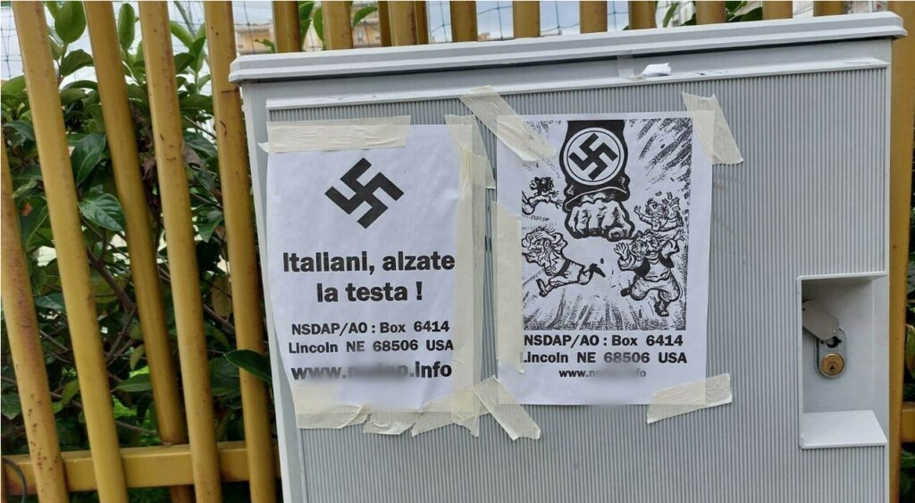Indagini in corso da parte degli agenti della Digos di Brindisi, a seguito del rinvenimento all’esterno di Parco Di Giulio di due volantini di stampo nazista, entrambi con la riproduzione di una svastica, di cui uno con un’illustrazione razzista e antisemita. La scoperta è stata fatta nella mattinata di oggi in via Bruno Buozzi, all’esterno del polmone verde cittadino. Si tratta di due fogli formato A4 attaccati con del nastro isolante su una cassetta dell’Enel. Un volantino riporta la scritta “Italiani, alzate la testa”, insieme all’indirizzo Url di una pagina web dell’estrema destra americana, all’interno della quale risultano pubblicate foto che ritraggono Eva Braun, moglie di Hitler. Gli agenti della Digos della questura di Brindisi, che indaga sul ritrovamento, hanno acquisito i due volantini ed avviato l’attività investigativa per risalire agli autori dei due manifesti. di Salvatore Morelli