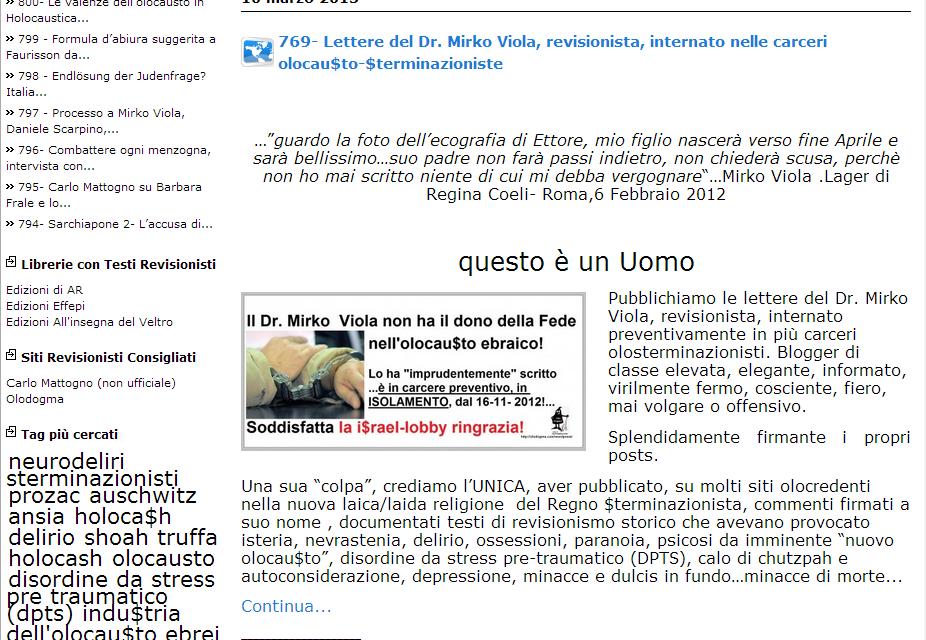 Il gruppo neonazista Militia Roma ha promosso una campagna antisemita attraverso il web contro il presidente della Comunità Ebraica di Roma Riccardo Pacifici «Libertà per Mirko Viola, spedisci anche tu una cartolina al giudeo Pacifici». L’invito, diffuso attraverso dei profili Facebook, prende spunto dalla vicenda dell’estremista Mirko Viola, già membro di Forza Nuova Como, arrestato e condannato nell’ aprile 2013 a due anni e 8 mesi per istigazione all’odio razziale. Per i giudici era lui, assieme ad altre tre persone, il moderatore del forum italiano di Stormfront, sito antisemita con basi in tutto il mondo. Forum nel quale venivano presi di mira politici, scrittori, giornalisti, magistrati di origine ebraica, in un concentrato di odio razziale con tanto di incitamento alla supremazia della razza bianca. I simpatizzanti di Militia imputano a Riccardo Pacifici di avere segnalato alle forze dell’ordine la mail che Mirko Viola gli aveva inviato mentre si trovava agli arresti domiciliare, iniziativa costata a Viola la revoca dei domiciliari con la disposizione, da parte del gip Carmine Castaldo, della custodia cautelare in carcere. «L’infamata» del rappresentante degli ebrei, più volte minacciato e insultato in questi anni da gruppi di estrema destra e finito nella black list apparsa su Stormfront (il sito italiano è stato oscurato),per i neonazisti capitolini merita ora una reprimenda pubblica a base di offese. Le cartoline sono indirizzate alla sede della Sinagoga di Roma, all’attenzione del destinatario Pacifici: «Vaffanculo giudeo Pacifici! Voi siete i padroni di un mondo che non rispecchia noi, e non è con le vostre maniere coercitive che cambierete la nostra testa pensante», scrive Trillitrilli Puccetti. «Onore al camerata Mirko che paga duramente per aver lottato a viso aperto contro l’abominio giudaico-massonico», è la chiosa apparsa sulla pagina Facebook di Militia Monteverde.