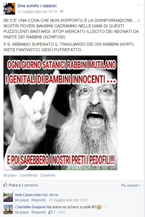 cheschifo_pedofilia Pubblicata il 11 Giugno 2015 alle 498 × 746 in “Che schifo i rabbini”, profilo Facebook antisemita