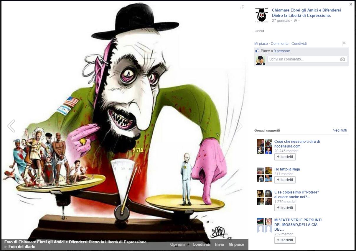 chiamare_ebrei_27gennaio Pubblicata il 31 Marzo 2015 alle 1208 × 851 in “Chiamare Ebrei gli Amici e Difendersi Dietro la Libertà di Espressione.”, comunità Facebook antisemita e razzista
