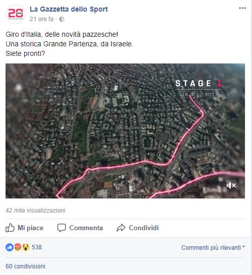 Il profilo Facebook del quotidiano sportivo La Gazzetta dello Sport pubblica un post multimediale dedicato al prossimo Giro d’Italia che partirà da Gerusalemme, seguono centinaia di commenti, molti dei quali di critica poiché per questi utenti il giro ciclistico d’Italia dovrebbe partire da una città italiana e non dall’estero, alcuni utenti, nel contestare la scelta degli organizzatori del Giro utilizzano argomentazioni antisioniste-antisemite.