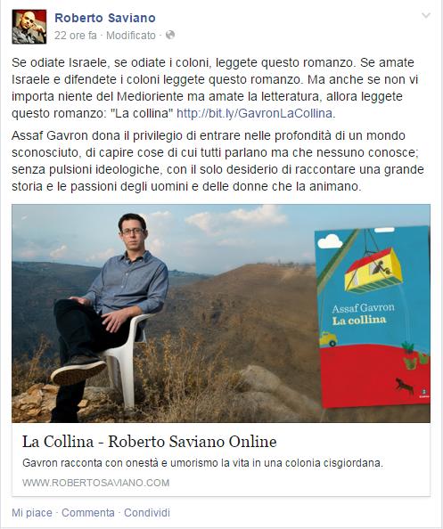 C’è chi la butta sul personale con un lapidario «Saviano ebreo». Chi avanza ardite ipotesi teologico-storiche: «Israele vive con la mentalità dell’ultima guerra, quel popolo è rimasto fermo a quell’epoca, si rendono antipatici perché pigolano sempre… solite storie che loro sono il popolo eletto, lo stesso popolo che ha crocifisso Nostro Signore». Chi sentenzia di «nazismo ebraico», di Israele come «il male del Medio Oriente» che «deve sparire dalla faccia della terra» e del titolare della pagina come suo servo («e gli rende tanto») e protettore degli assassini. È bastato che Roberto Saviano postasse sulla sua seguitissima pagina Facebook un consiglio di lettura, nella fattispecie La collina del giovane autore israeliano Assaf Gavron, appena tradotto dalla Giuntina, per innescare una valanga di commenti tanto deliranti quanto indignati. «Se odiate Israele, se odiate i coloni, leggete questo romanzo. Se amate Israele e difendete i coloni leggete questo romanzo. Ma anche se non vi importa niente del Medio Oriente ma amate la letteratura, allora leggete questo romanzo»: in modo più bipartisan di così non poteva esprimersi. Ma a quanto pare dalla neutralità (e in fondo dal senso stesso) della letteratura al pregiudizio bell’e buono il passo è molto breve, almeno sui social network. Che, tanto per cambiare, sfoderano il consueto repertorio di un antisemitismo ormai disarcionato da ogni decenza, condito di un’ignoranza disarmante. Difficile immaginare quale possa essere la terapia, in questo mondo della comunicazione globale dove tutti scrivono ma quasi nessuno legge.
