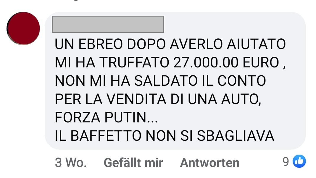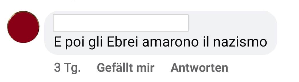 Vari commenti antisemiti su Facebook di odio generico verso gli ebrei e di matrice neonazista, alcuni in tono sarcastico: “E poi gli ebrei amarono il nazismo”, “Forza Putin… Il baffetto aveva ragione”, “Il popolo eletto”.