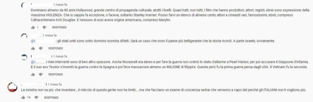 Il canale YouTube di un programma radiofonico della Rai, pubblica un video dedicato alla commissione parlamentare contro l’odio promossa dalla senatrice a vita Liliana Segre, seguono centinaia di commenti in larga parte ostili a Liliana Segre, frequente l’uso di miti cospirativi.