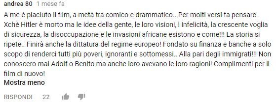 Un utente ha caricato su YouTube il film tedesco del 2015 “Lui è tornato”, commedia che racconta del risveglio di Adolf Hitler da una lunga ibernazione e del suo ritorno a Berlino. Il film riceve più di 100 commenti, la maggior parte dei quali di esaltazione del nazismo, razzisti ed antisemiti.