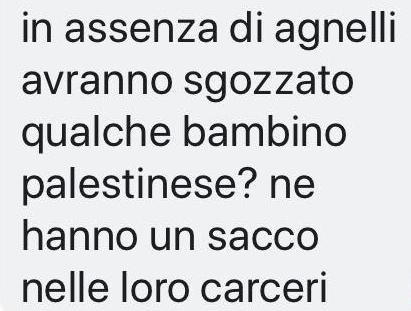 «In assenza di agnelli avranno sgozzato qualche bambino palestinese? Ne hanno un sacco nelle loro carceri»