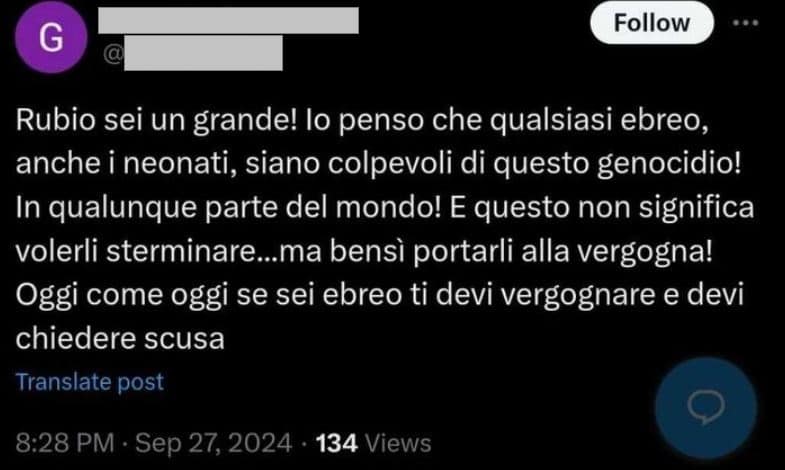 Stampa 27 Settembre 2024 X, commento con contenuti antisemiti Luogo: X/Twitter Fonte: Segnalazione “Io penso che qualsiasi ebreo, anche i neonati, siano colpevoli di questo genocidio!” Utente su X considera gli ebrei responsabili collettivamente di genocidio.