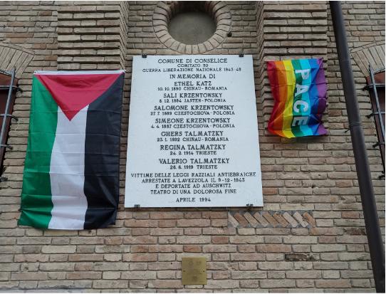 A Conselice, in provincia di Ravenna, è stata esposta una bandiera della Palestina accanto alla lapide che ricorda gli ebrei arrestati a causa delle leggi razziali antiebraiche, catturati a Lavezzola nel 1943 e deportati ad Auschwitz. In questo modo, viene indirettamente paragonata la situazione attuale a Gaza a quella del 1943 sotto il regime nazifascista.