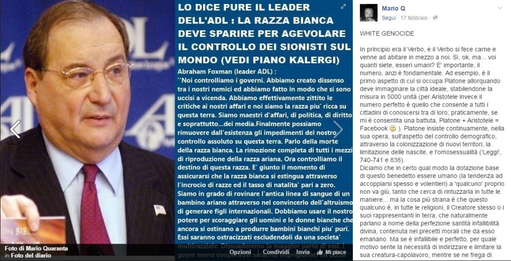 Mario Q. gestisce un profilo Facebook personale dedicato alla diffusione di teorie cospirativiste, che talvolta assumono anche connotati antisemiti .