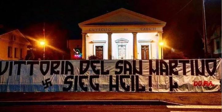 La svastica da una parte, il fascio littorio dall’altra, nel mezzo una frase: “Vittoria del san Martino – Sieg Heil”. Lo striscione (sopra, nella foto) è stato esposto sabato sera a Cuveglio (Varese), di fronte al monumento ai caduti che si trova lungo una via dedicata alla battaglia partigiana del San Martino, combattuta nell’autunno del 1943 fra truppe di occupazione tedesche e repubblichini contro formazioni partigiane. Ad esporre la scritta è stata la formazione neonazista Do.Ra che ha sede ad Azzate. Lo striscione è rimasto esposto per poco tempo, poi rimosso dalla Digos. Non è la prima volta che iniziative di questo genere si verificano in Valcuvia. Protagonisti sempre i neonazisti di Do.Ra.