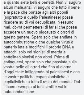 «Spero solo che andiate in autocombustione o che qualche virus o batterio letale modifichi il proprio DNA e attacchi solo voi sionisti di mer.. e sottolineo sionisti non ebrei»