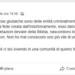Un nutrito gruppo di giovani simpatizzanti della destra neonazista è spesso impegnato su Facebook in discussioni dai forti toni antisemiti. Alcuni partecipanti a questi forum , a causa del contenuto estremista dei loro messaggi, vengono periodicamente ‘bannati’ dai gestori del social ma, attraverso nuovi profili, tornano subito online. Gli pseudonimi scelti da questi utenti si richiamano spesso, con lievi storpiature, ai massimi dirigenti del nazionalsocialismo hitleriano, alcuni di essi invece usano come foto di copertina quelle di esponenti dell’ebraismo italiano. Il linguaggio utilizzato in questi forum è diretto e spesso intriso di un pesante umorismo antisemita, ad esempio gli ebrei vengono appellati come “nasoni”, anche i nomi dei social-network ritenuti “nasoni” vengono modificati e così Facebook diventa “Judebook” e così via. I fatti di cronaca fanno poi da spunto per le discussioni, ad esempio la richiesta di abolizione della “Legge Mancino” formulata dal Ministro della famiglia è stata accolta con favore poiché in questi ambienti la Mancino viene vista come una “legge giudaica” conforme alle “norme abramitiche voluta e scritta dai giudei”, ed anche il crollo del ponte Morandi a Genova è stato attribuito alla “nasuta rapacità dei giudei”.