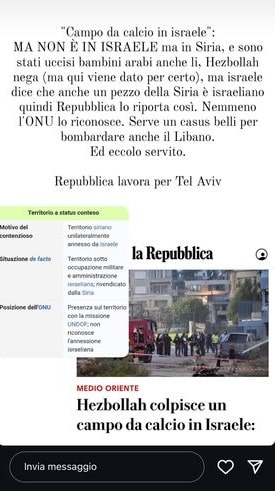Un noto influencer pubblica nelle storie Instagram alcuni contenuti che negano il fatto che Hezbollah sia responsabile dell’uccisione di 12 bambini in un campo di calcio nel nord di Israele, sostenendo che il quotidiano nazionale La Repubblica lavori per Tel Aviv.