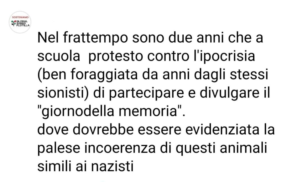 Docente di scuola superiore commenta in questo modo la richiesta di sottoscrivere un documento di insegnanti ed educatori per la Palestina: «Nel frattempo sono due anni che a scuola protesto contro l’ipocrisia (ben foraggiata da anni dagli stessi sionisti) di partecipare e divulgare il “giornodella memoria”. dove dovrebbe essere evidenziata la palese incoerenza di questi animali simili ai nazisti».