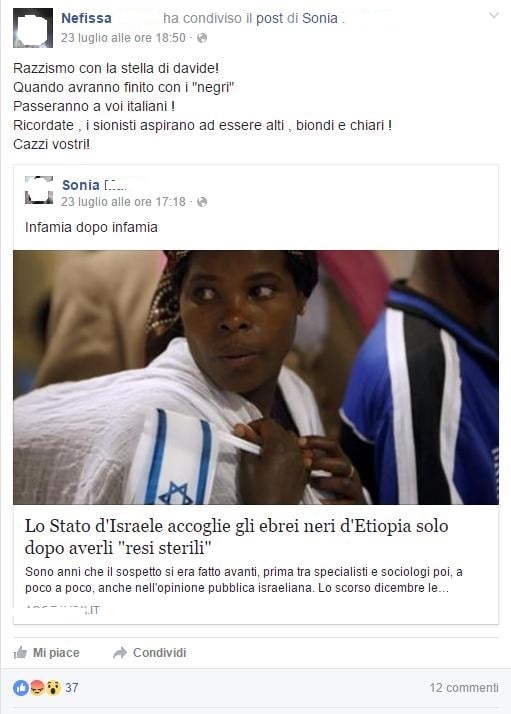 Nefissa L. gestisce due profili Facebook personali attraverso i quali diffonde polemiche antisemite, specie in chiave di ostilità ideologica contro lo Stato di Israele ed il sionismo.