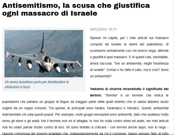 In “Antisemitismo, la scusa che giustifica ogni massacro di Israele” del 4 dicembre 2014 AR fa ampio uso di discorsi e stereotipi antisemiti sotto forma di polemica contro Israele. Alcuni esempi: “Infatti, è antisemita non solo chi odia gli ebrei, ma anche chi odia gli arabi. Quindi sono loro i primi antisemiti, sono loro i primi nazisti. I sionisti, cioè i sostenitori della supremazia razziale degli ebrei sugli arabi, sono i primi antisemiti.“
