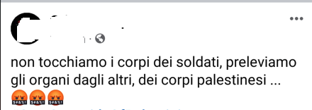 Utente Facebook posta un commento che avvalora la leggenda nera dei “sionisti ladri di organi umani”. Alla base di questa accusa c’è l’antico mito del cannibalismo rituale, ovvero l’idea che gli ebrei pratichino rituali di sangue in spregio ai non ebrei.