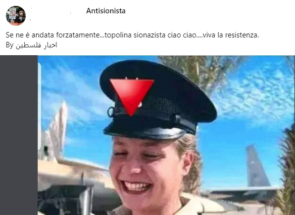 Profilo Facebook che si definisce “antisionista” posta materiale antisemita e fa apologia del terrorismo jihadista. Slogan e iconografia sono quelli di Hamas.Il modello di post maggiormente utilizzato da questo profilo consiste nella fotografia di un israeliano ucciso da Hamas con il triangolo rosso e frasi tipo il topo/ratto nazisionista è andato finalmente all’inferno. I commenti dei followers di questo sono violenti, apologetici del terrorismo e pro Hamas.