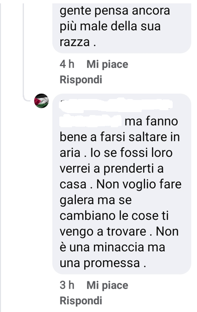 Stampa 17 Febbraio 2024 Facebook, apologia di Hamas e minacce Fonte: Segnalazione «Viva Hamas» Utente Facebook fa apologia di Hamas («Viva Hamas») e del terrorismo palestinese, anche di quello suicida («fanno bene a farsi saltare in aria») e minaccia una persona («ti vengo a trovare»).