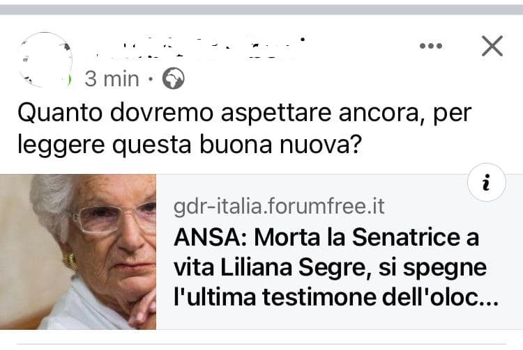 Stampa 17 Gennaio 2024 Facebook, auguri di morte alla senatrice Segre Fonte: Segnalazione OS «Quanto dovremo aspettare ancora…» Utente Facebook condivide una notizia falsa sulla dipartita della senatrice Segre e la commenta con un augurio di morte alla signora..