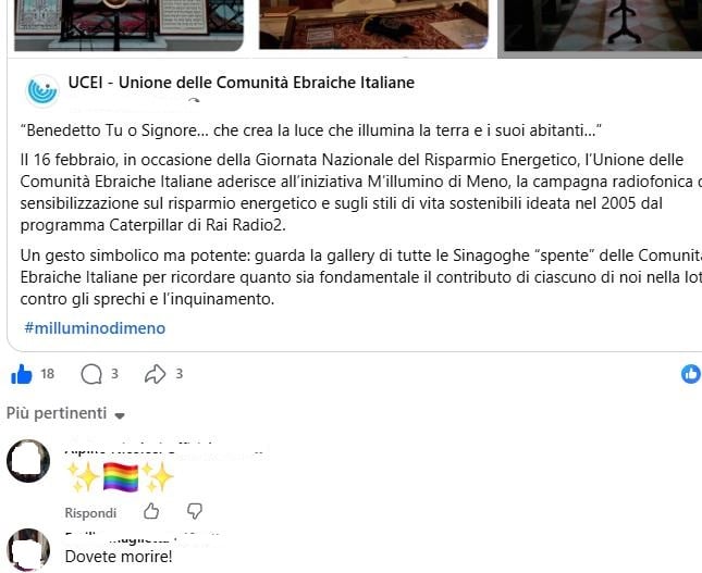 La Comunità ebraica di Parma condivide sulla sua pagina Facebook un post dell’UCEI con le immagini delle sinagoghe italiane, un utente lo commenta così: «Dovete morire».