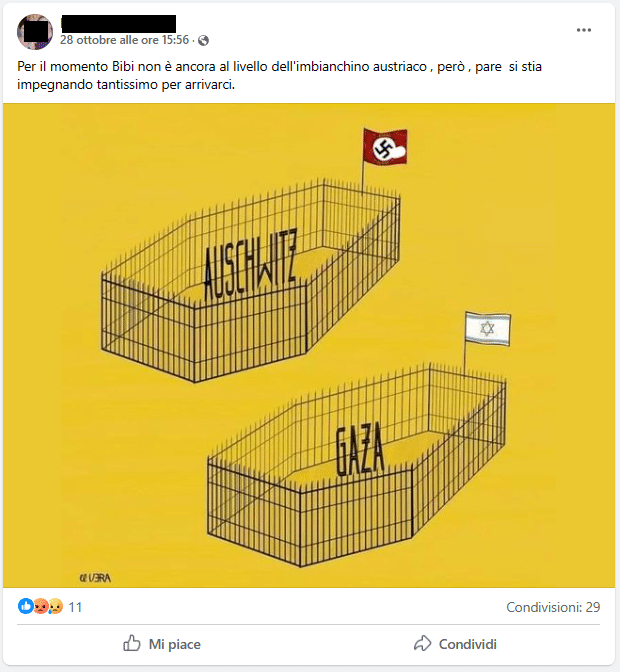 Post che paragona il premier Netanyahu ad Adolf Hitler corredato da una vignetta che equipara Gaza ad Auschwitz. Il post è stato ampiamente condiviso in rete.