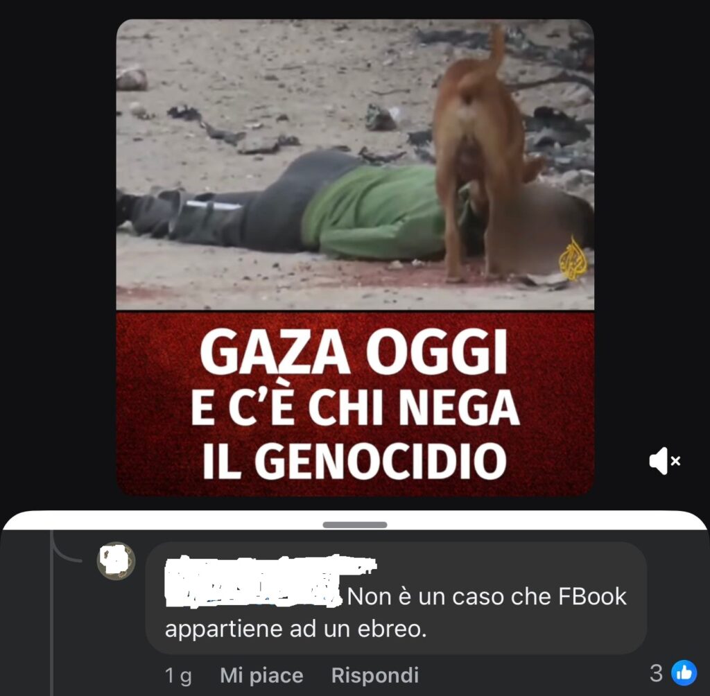 Stampa 19 Dicembre 2024 Facebook, commenti antisemiti Fonte: Segnalazione CE «Ecco a voi, il popolo “eletto da Dio” che si conquista la “Terra promessa” a suon di bombe, razzie e genocidi» Utenti Facebook simpatizzanti pro pal postano commenti antisemiti ispirati al conflitto tra Hamas ed Israele.