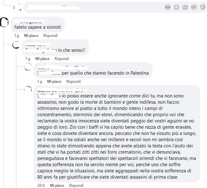 Stampa 30 Gennaio 2025 Facebook, commenti antisemiti Fonte: Segnalazione CE «Zio con i baffi vi ha capito bene che razza di gente eravate…» Il profilo Facebook di un’organizzazione giovanile ebraica pubblica un video dedicato al Giorno della memoria, ed un utente lo commenta in chiave antisemitica.