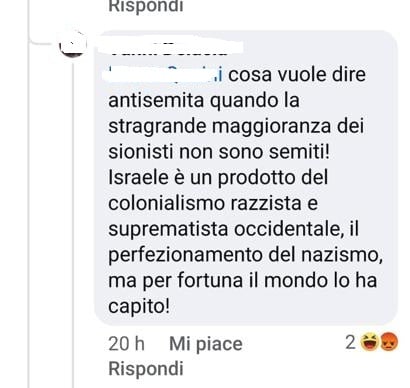 Utenti Facebook commentano un articolo di giornale dedicato a Francesca Albanese, relatrice speciale delle Nazioni unite nota per le sue posizioni marcatamente “antisioniste”, scrivendo messaggi antisemiti. Paragoni tra sionisti e nazisti, accuse di razzismo e tendenze suprematiste e genocide ma anche teorie cospirative secondo le quali i “veri ebrei” non sarebbero “sionisti”.