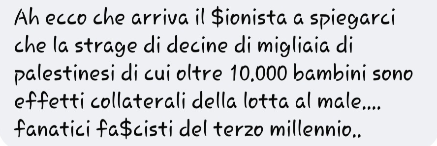 Simpatizzante dell’estrema sinistra interloquisce su Facebook con un simpatizzante di Israele a proposito dell’attuale conflitto e lo attacca usando stereotipi antisemiti principalmente basati sul fatto che i “$ionisti” sarebbero fascisti, stragisti e razzisti.