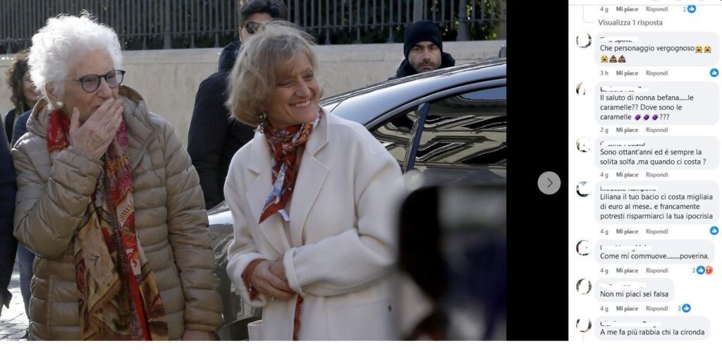 Pagina Facebook pubblica un post con la fotografia di Liliana Segre con la presidente UCEI Noemi Di Segni corredato dalla scritta : «Il bacio di Liliana Segre a una scolaresca nel Giorno della Memoria.». Seguono numerosi volgari commenti di odio contro la senatrice.