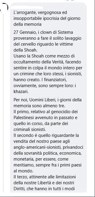 Pagina Facebook posta sul Giorno della memoria, seguono commenti antisemiti legati al conflitto tra Hamas ed Israele innervati di vari elementi di antisemitismo, in particolare quelli di stampo cospirativo.