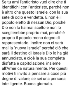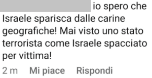 Centinaia di commenti segnalati sotto diverse notizie su Facebook. Lo Stato di Israele viene demonizzato linguaggio religioso e apocalittico, si ripropongono accuse teologiche antiche, aggiornate oggi in chiave geopolitica. Quando si paragona uno Stato a un’entità satanica (“anticristo”), si disumanizzano i suoi cittadini e si riprende la tradizione antiebraica cristiana, che identificava gli ebrei come nemici cosmici della verità e della salvezza. Dovrebbe essere facile comprendere perché si tratti di antisemitismo.