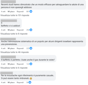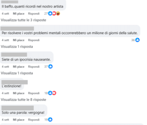 “Il Baffetto si addice!” “Il Baffetto è perfetto. Usate anche il gas durante le visite?” “Il baffo… quanti ricordi del nostro artista” “Siete di una ipocrisia nauseante” “L’estinzione!” “solo il baffetto vi rappresenta… siete come lui se non peggio”