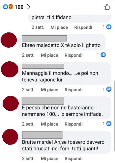 Tre utenti italiani e una donna francese commentano un post, auspicando lo sterminio degli ebrei, inneggiando all’intifada. I commenti sono sotto ad un post su Facebook.